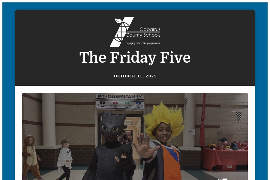 The Friday Five October 31, 2025 Happy Halloween Friday, Cabarrus County Schools families! We hope you've had a great week! As a remin. . .